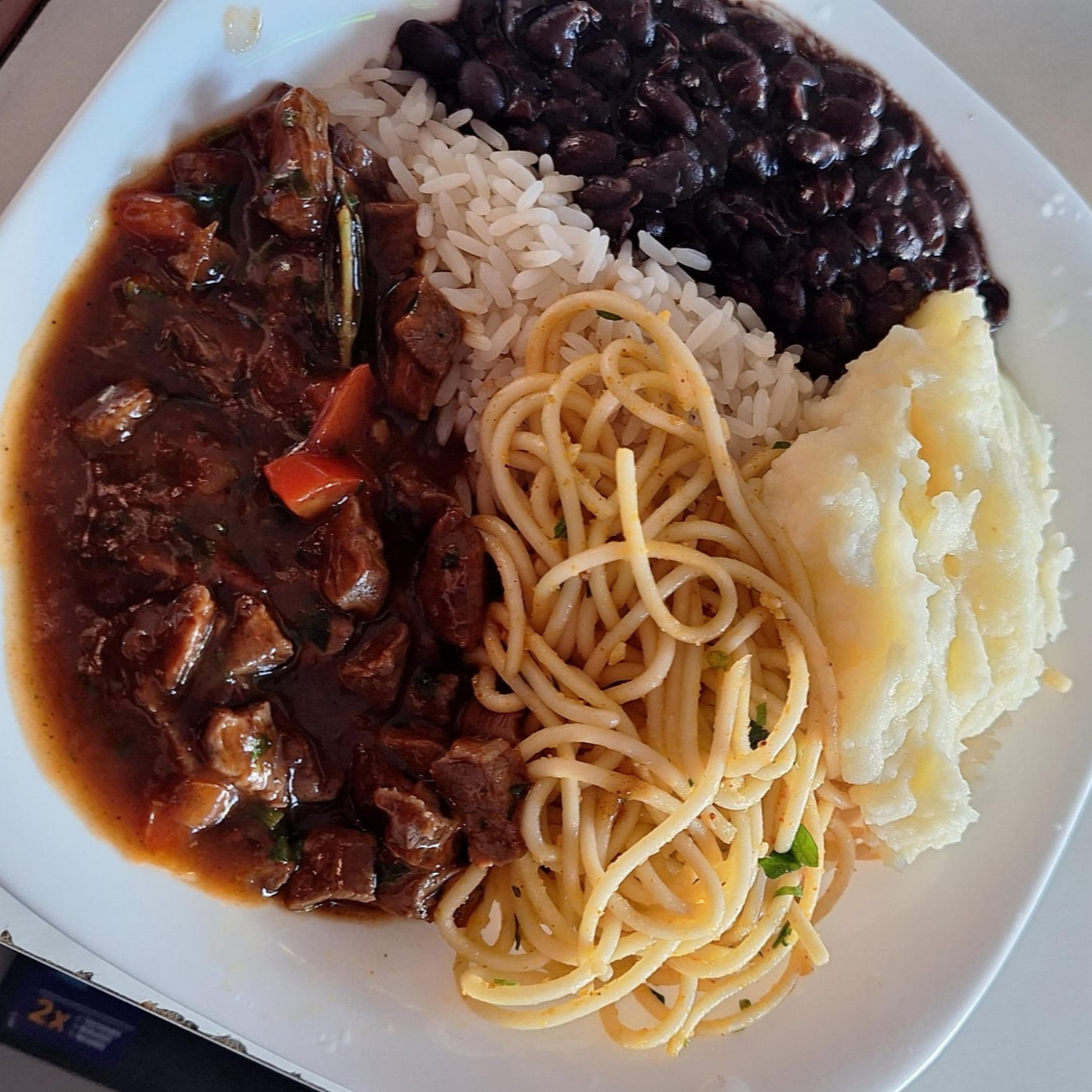 Um delicioso Picadinho de Carne acompanhado de Arroz, Feijão, Macarrão, Purê, Farofa e Salada "Maionese ou Verde".