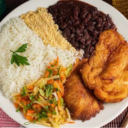 Um prato, cuidadosamente preparado, que traz em sua composição o sabor autêntico e irresistível de um frango grelhado à perfeição. Acompanhado de um arroz soltinho e bem temperado, do nosso feijão caseiro, cuidadosamente cozido e da farofa crocante e saborosa, que adiciona uma textura única à refeição. Ideal para um almoço saboroso.
