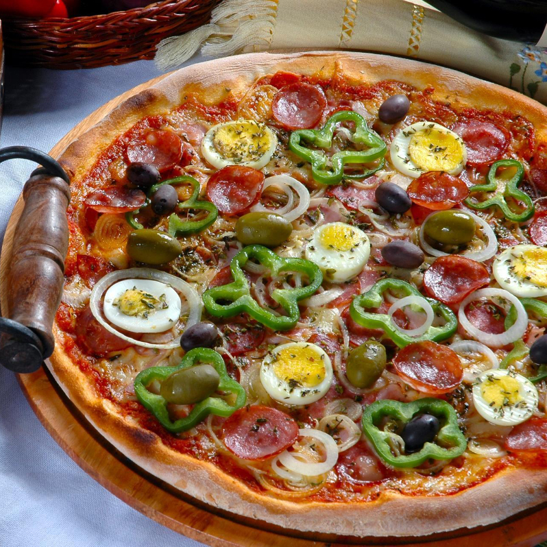 Presunto ,ovo,cebola,azeitona e pimentão e ervilha.
