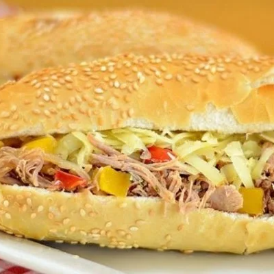 PÃO BAGUETTE,MOLHO DE ALHO,ALFACE,VINAGRETE ESPECIAL,PERNIL COM TEMPERO ARABE,