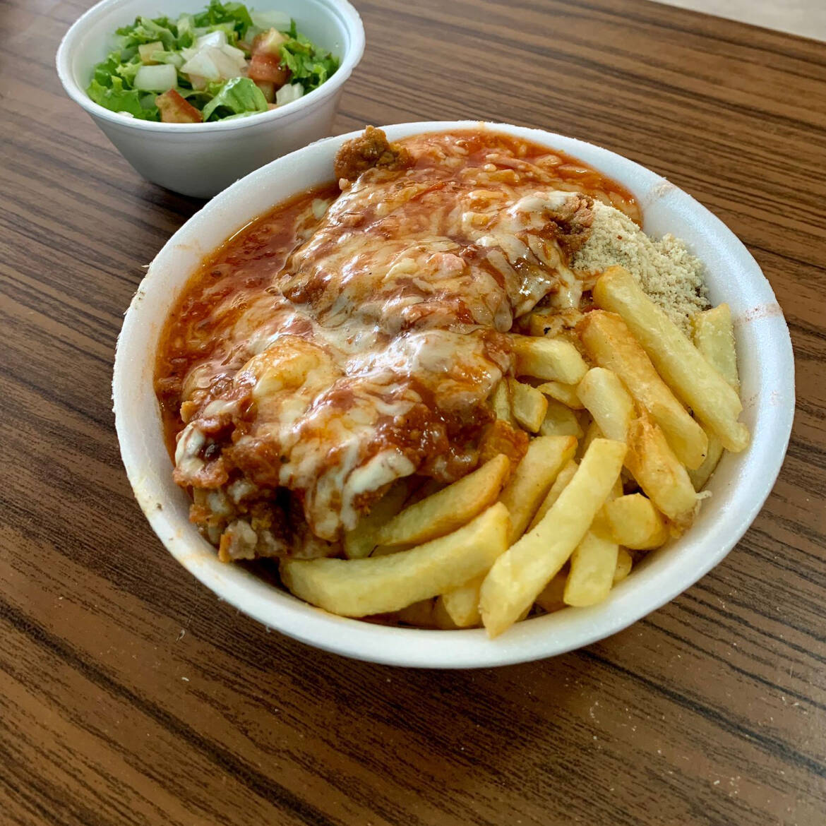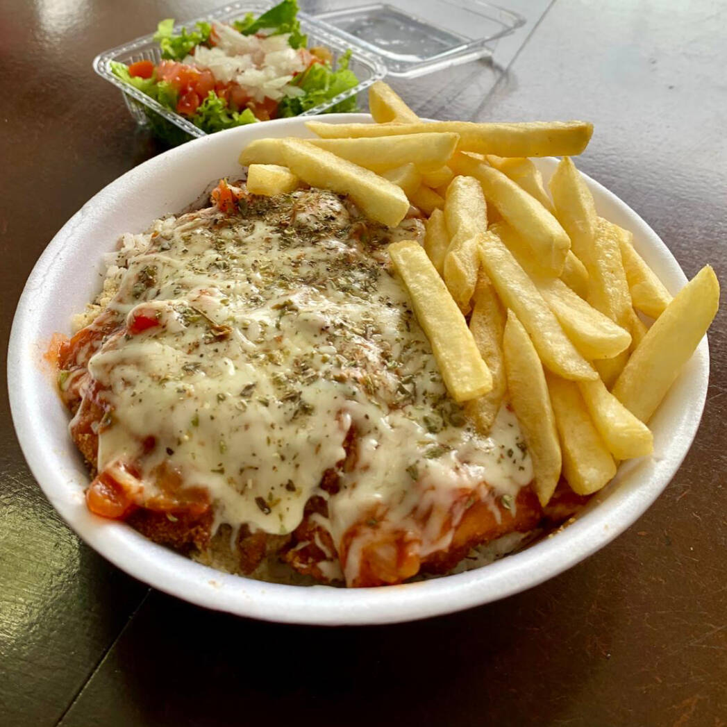 Um delicioso Bife ao Molho Parmegiana com Fritas, salada verde, arroz, feijão e farofa.