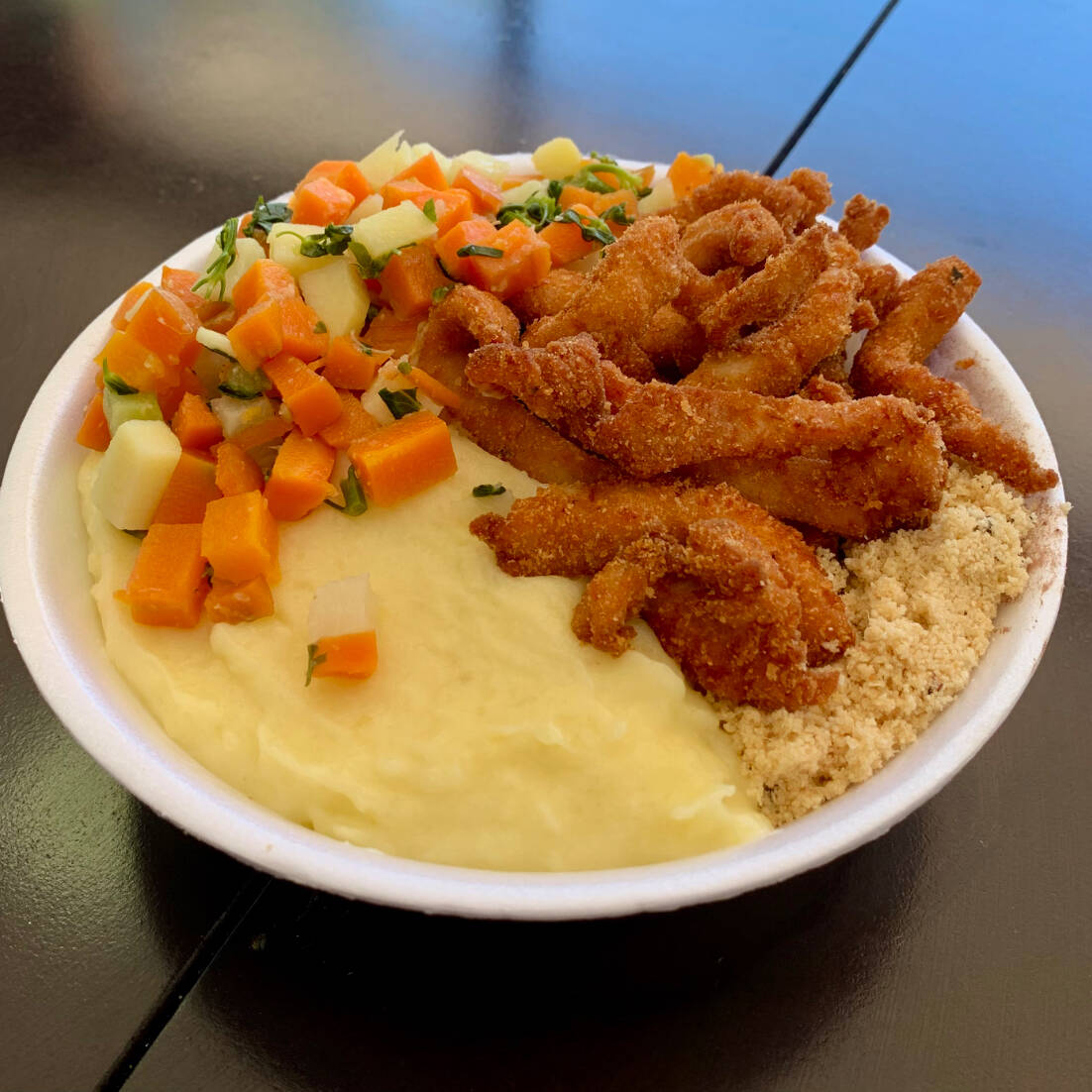 Iscas de Frango à milanesa acompanhado de purê e legumes, arroz, feijão e farofa.
