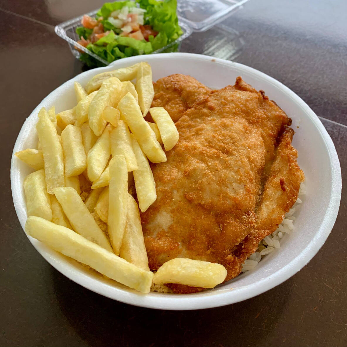 Um delicioso frango à parmegiana acompanhado de fritas, salada verde, arroz, feijão e farofa.