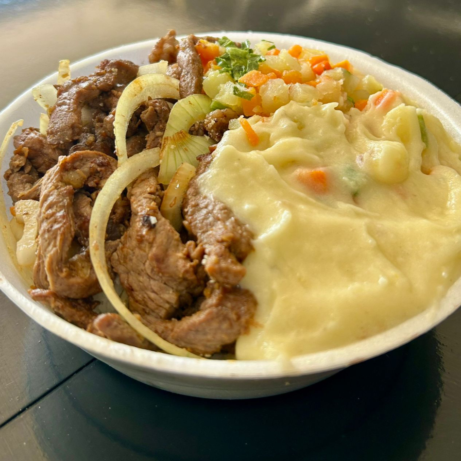 Iscas de Contra Filé acompanhadas de Purê, Legumes, arroz, feijão,