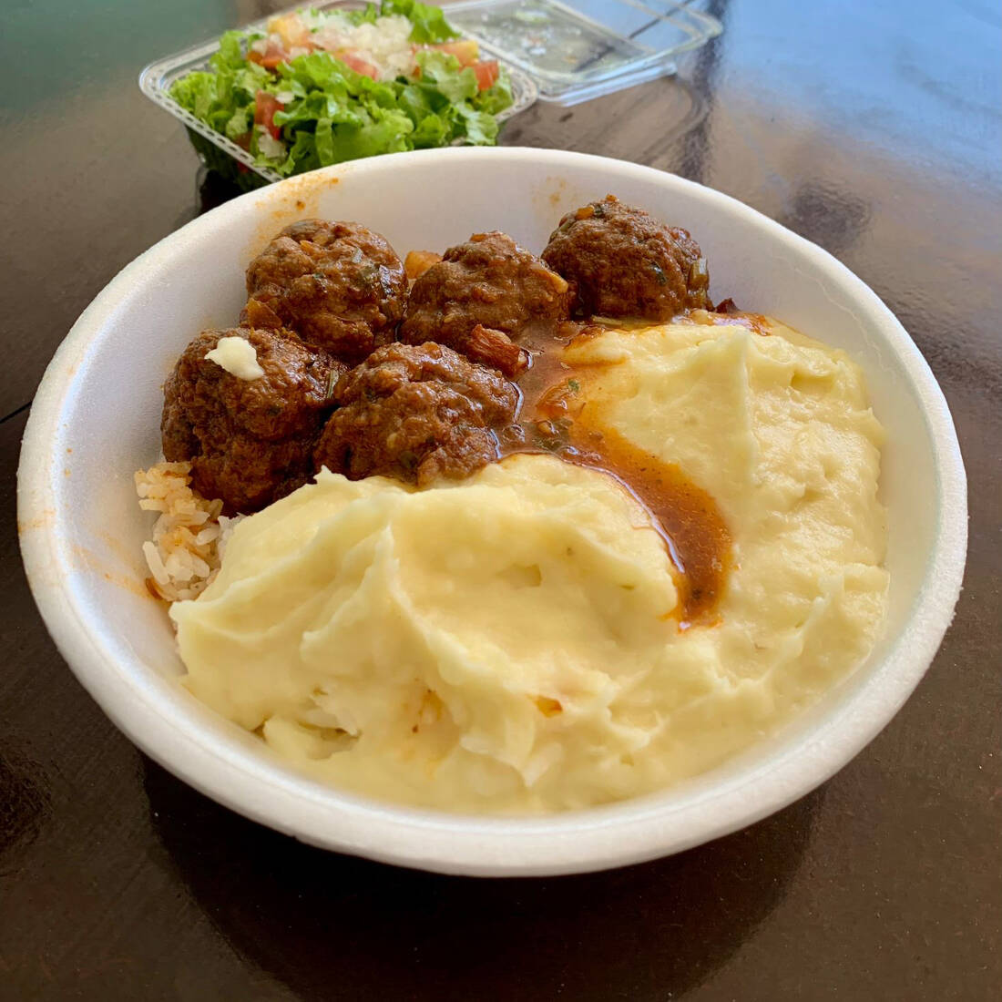 Almôndegas com Purê, salada verde, arroz, feijão e farofa.