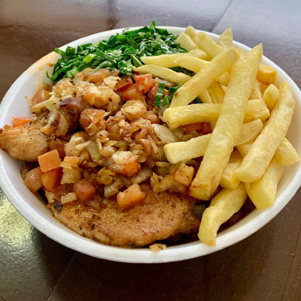 Filé de Alcatra Suína com Couve e Fritas, arroz, feijão, farofa.