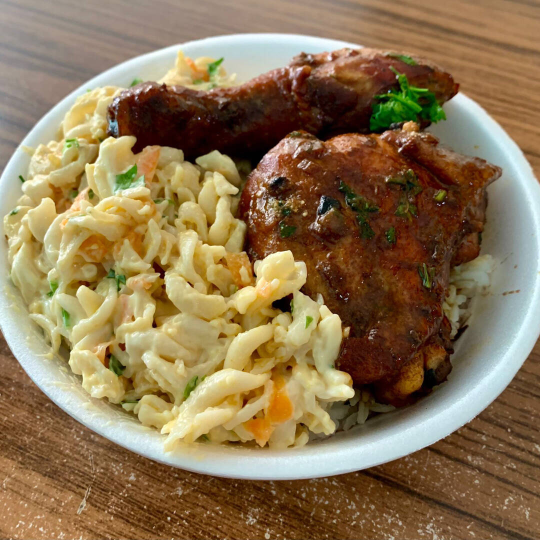 Duas sobrecoxas com Macarronese, arroz, feijão, farofa e salada verde