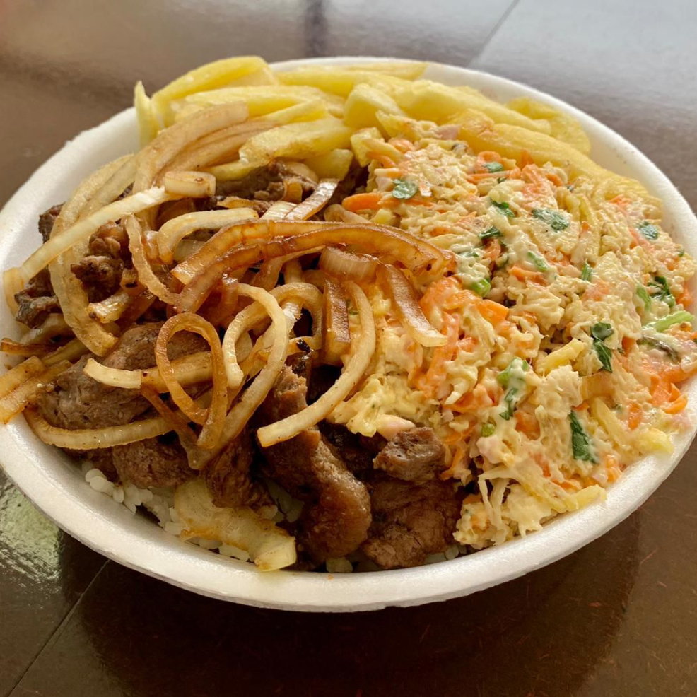 Deliciosas iscas de contra filé acompanhadas de salpicão, fritas, arroz, feijão e salada verde