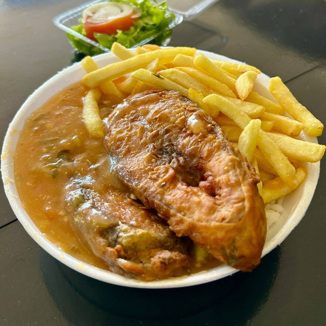 2 Postas de tainha com pirão, arroz, fritas e salada verde.