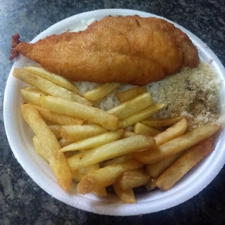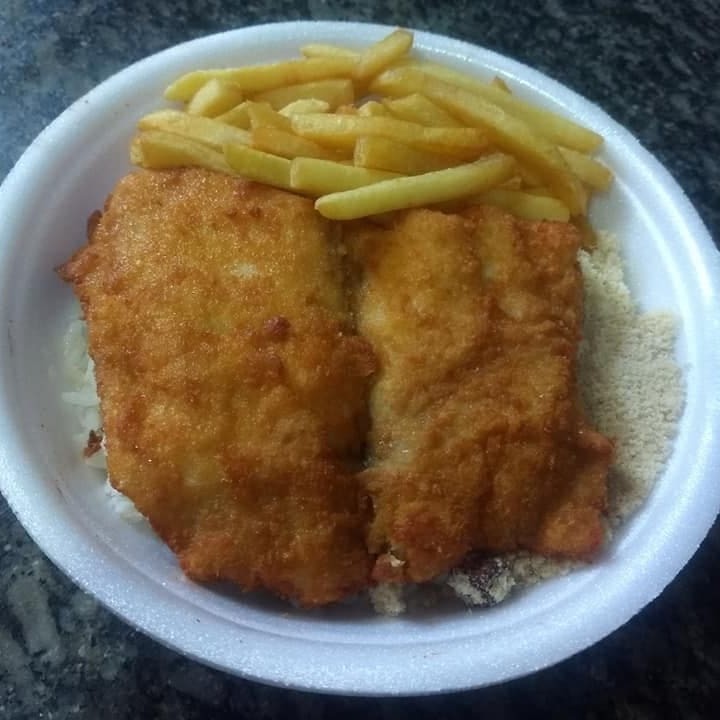 Filé peixe com fritas, arroz, farofa e feijão separado.