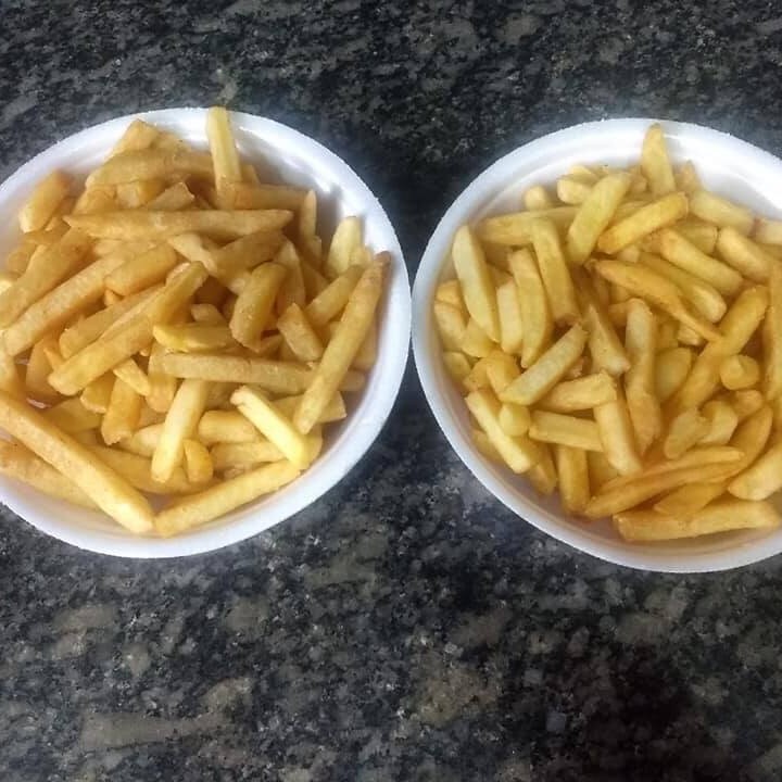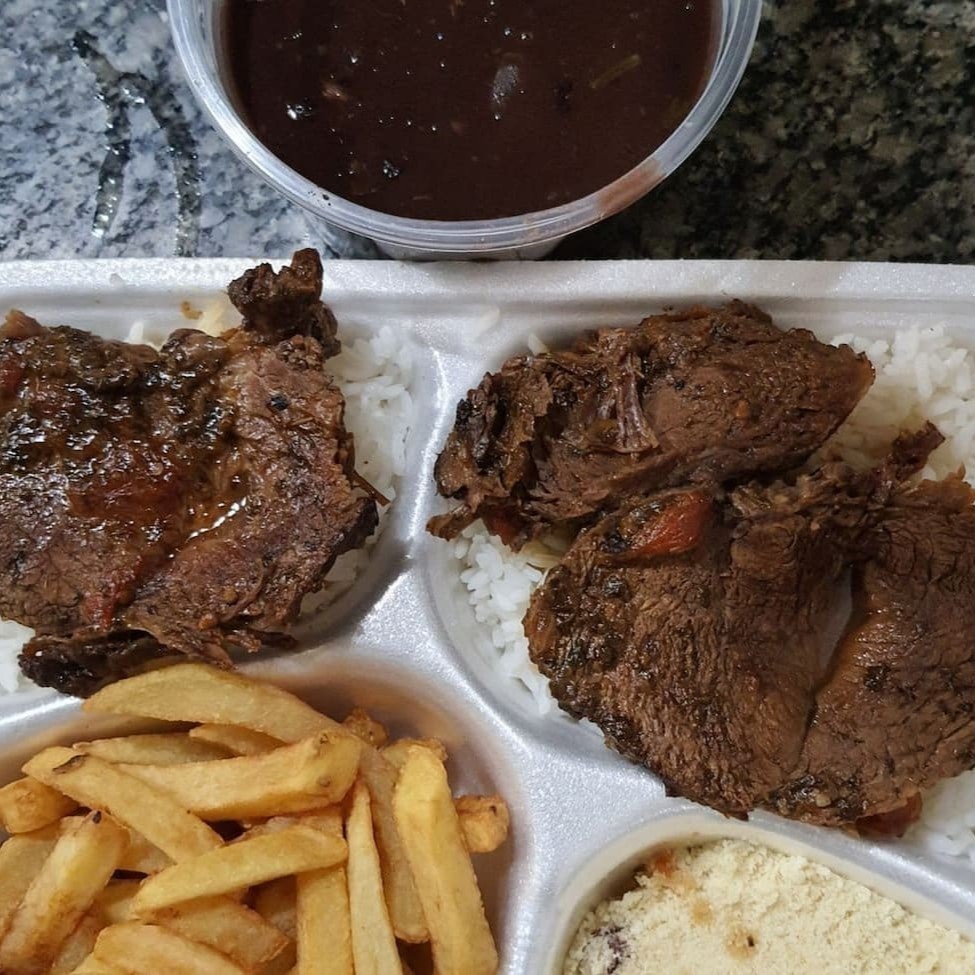 Acompanhamentos: arroz, feijão, farofa e batata fritas.