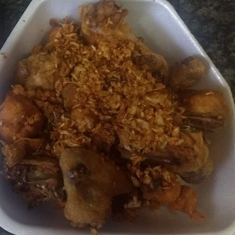 Frango inteiro, cortado em pedaços pequeno e alho dourado. Serve duas pessoas.