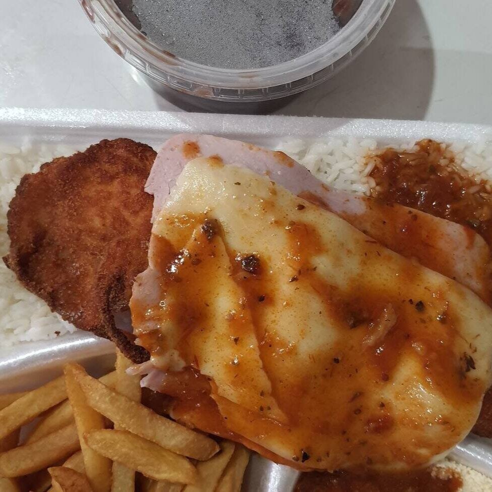 Filé frango com mussarela, presunto e molho, fritas, arroz, farofa e feijão separado.