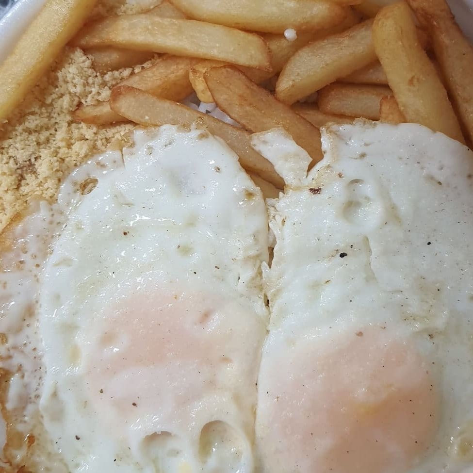 Acompanhamentos; Arroz, feijão, farofa, dois ovos frito e batata frita.