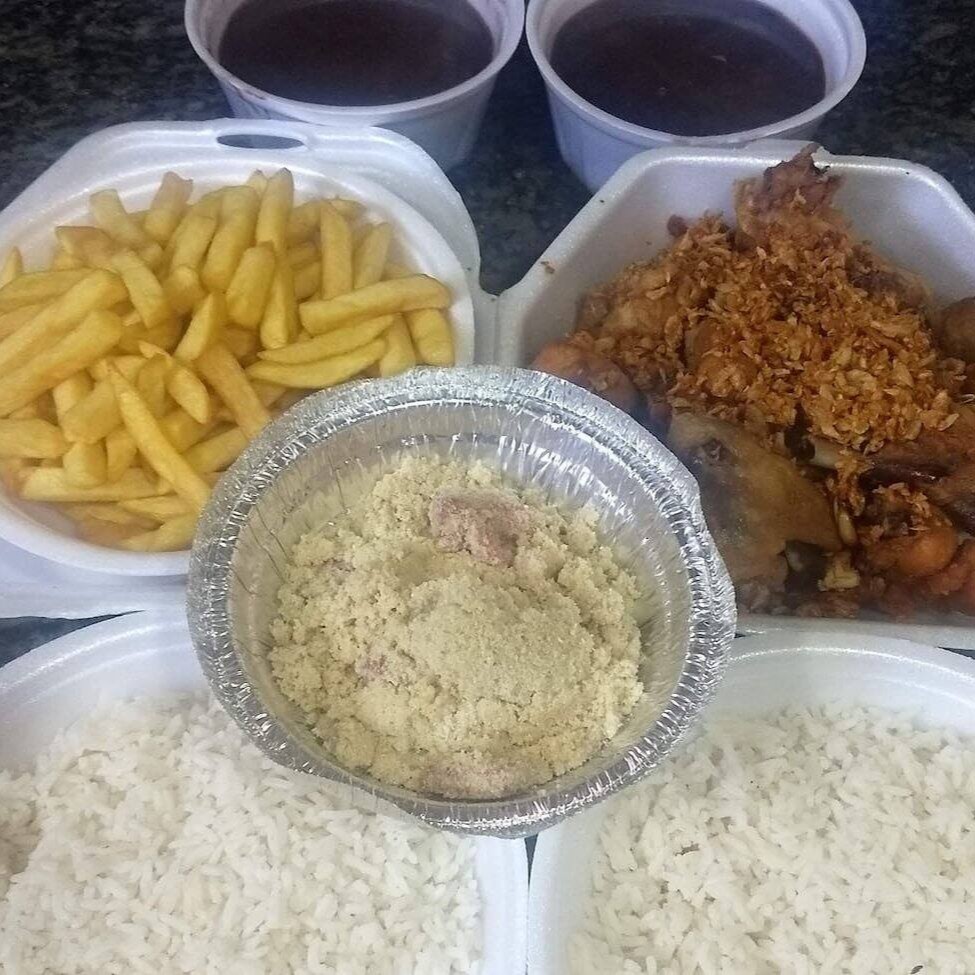 Acompanhamentos; 2 quentinhas de arroz, 2 quentinhas de feijão, 1 quentinha de batata frita, 1 quentinha de farofa e 1 frango inteiro cortado em pedaços.