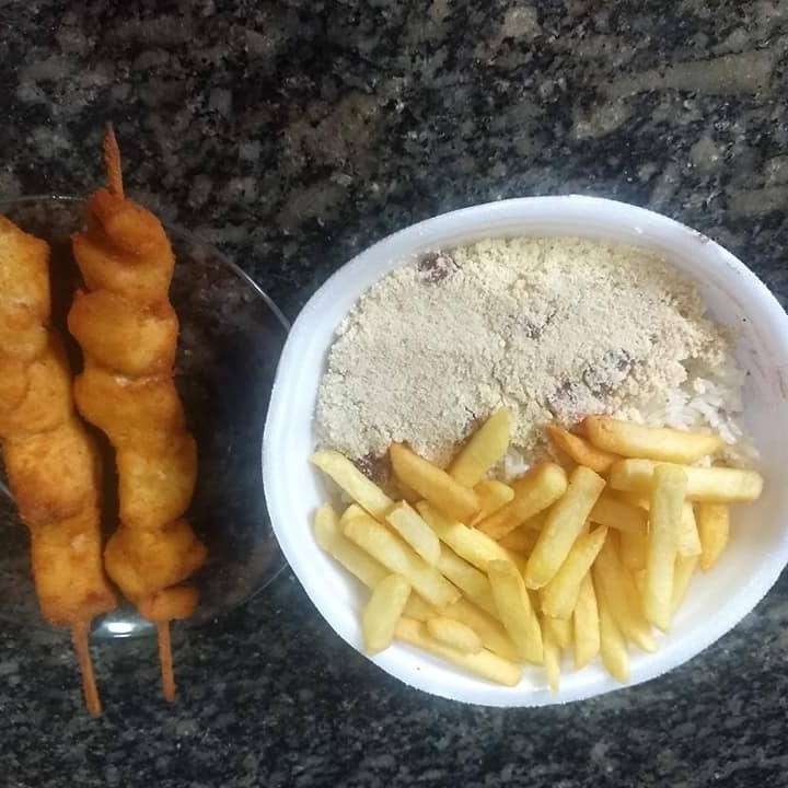 Acompanhamentos; 2 unidades espetinho frango, arroz, feijão, farofa e batata fritas.