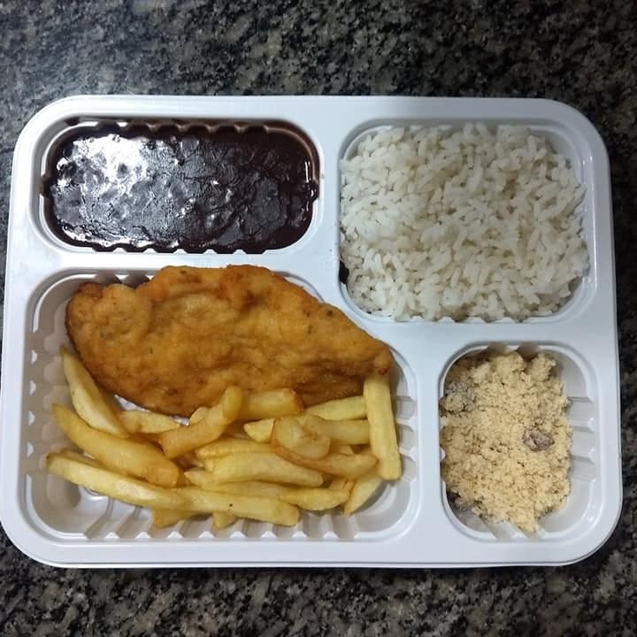 Acompanhamento: arroz, feijão, farofa e batata frita.