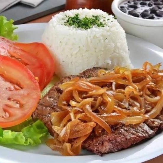 Alcatra a cebolada, arroz, feijão