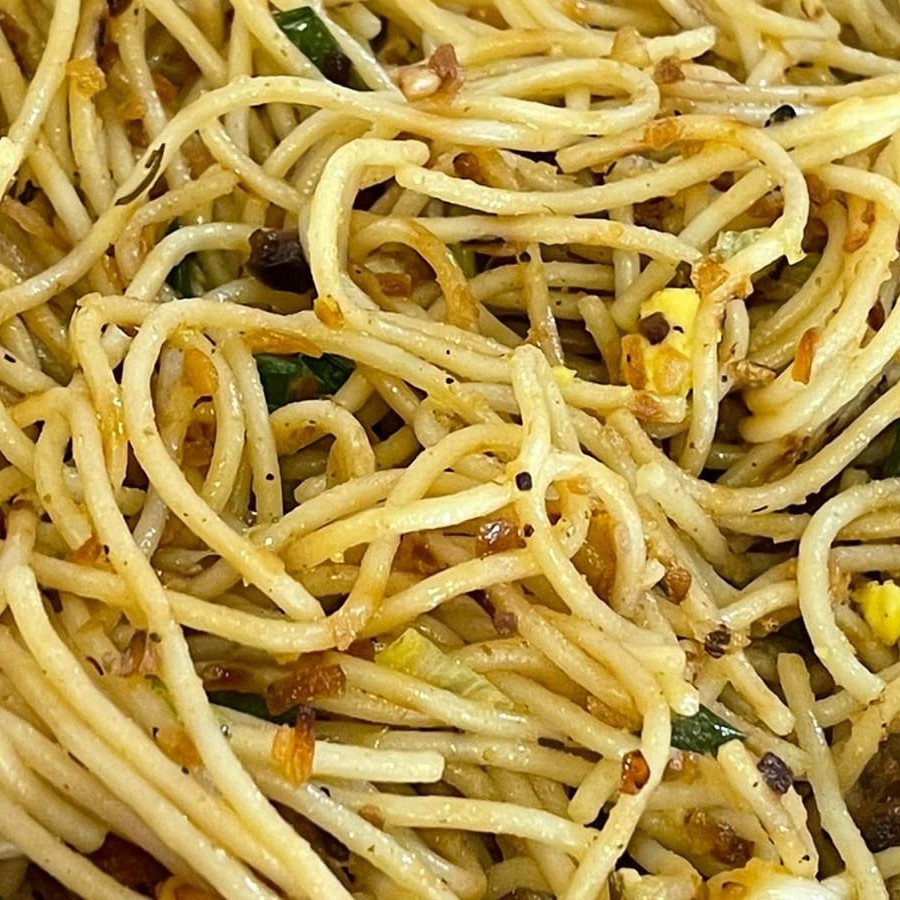 Macarrão espaguete feito ao alho e óleo com condimentos da casa