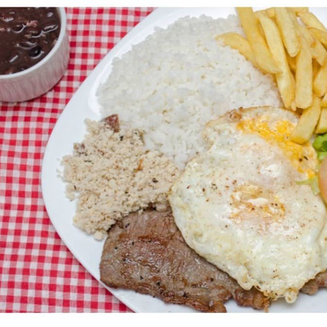 Acomp: arroz, feijão, farofa, 2 ovos e fritas.