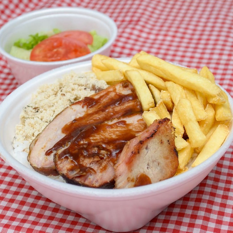 Acomp: arroz, feijão, farofa, molho barbecue e fritas.
