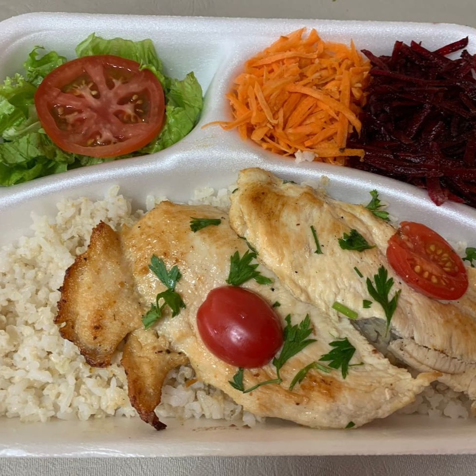 Acomp: arroz integral, feijão, cenoura e beterraba raladas e salada.