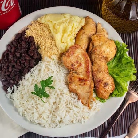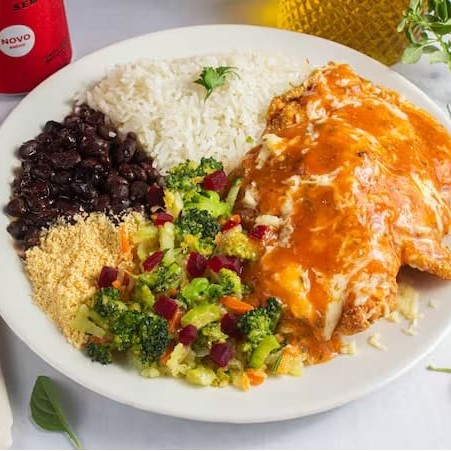 Delicioso Frango Grelhado. Acompanha arroz, feijão, farofa e mais uma guarnição a sua escolha. Tags: Frango grelhado, marmita, fritas, quentinhas, batata, filé de frango, combo, casal, família, perto de casa, promoção, cupom de desconto, promo, oferta, off, 0800, taxa grátis.