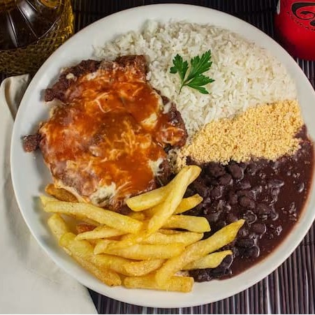 Delicioso Bife à Parmegiana Coberto por Queijo Muçarela Derretido, Molho de Tomate e Orégano. Acompanha arroz, feijão, farofa e mais uma guarnição a sua escolha. Sua refeição é servida em quentinha com divisórias. Tags: Bife à Parmegiana, alcatra, contrafilé, marmita, muçarela, molho de tomate, fritas, quentinhas, batata, combo, casal, família, perto de casa, promoção, cupom de desconto, promo, oferta, off, 0800, taxa grátis.