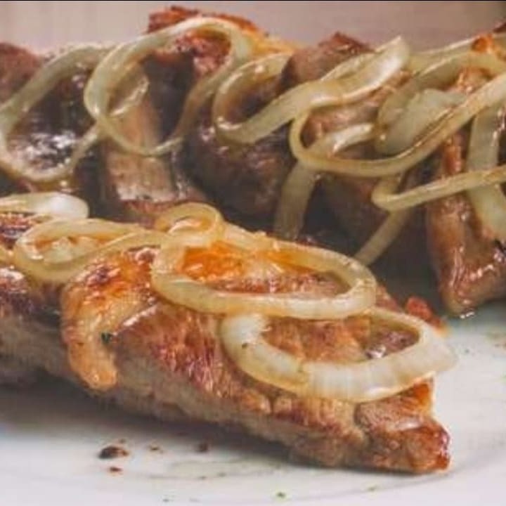 Delicioso Bife de Alcatra Acebolado Acompanha arroz, feijão, farofa e mais uma guarnição a sua escolha. Tags: Bife de alcatra acebolado, marmita, fritas, quentinhas, batata, cebola, combo, casal, família, perto de casa, promoção, cupom de desconto, promo, oferta, off, 0800, taxa grátis.