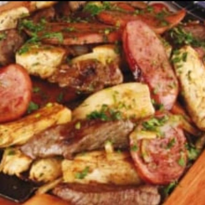 Churrasquinho Misto, composto de: Carne, Linguiça e Frango. Acompanha arroz, feijão, farofa e mais uma guarnição a sua escolha. Tags: Churrasco misto, marmita, fritas, quentinhas, molho à campanha, batata, combo, casal, família, perto de casa, promoção, cupom de desconto, promo, oferta, off, 0800, taxa grátis.