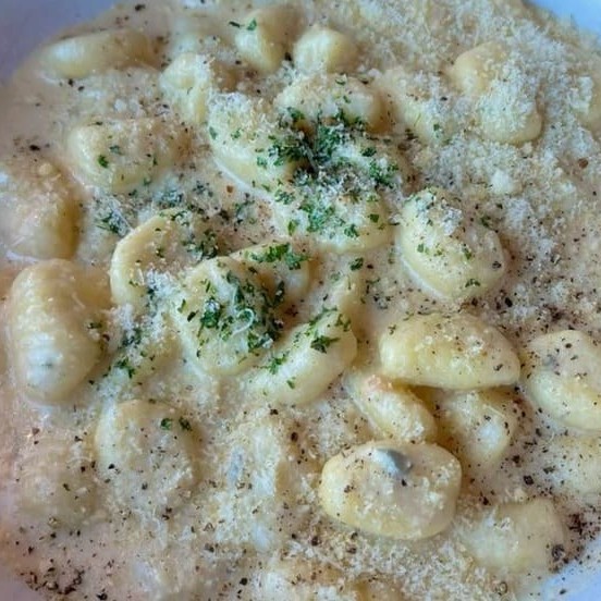 Armita com nhoque caseiro de batata inglesa ao molho branco cremoso, servido com camarões suculentos e temperados.