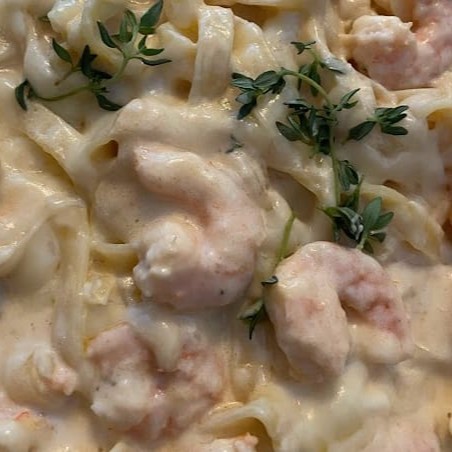 Marmita com fettuccine ao molho branco cremoso, servido com camarões suculentos e temperados.