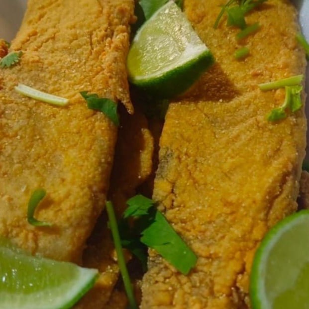 Porção de posta de tilápia frita, temperada no ponto certo, crocante por fora e macia por dentro.