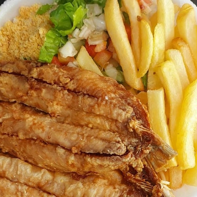 Combo com filé de peixe frito, acompanhado de arroz branco soltinho, pirão saboroso, molho de camarão cremoso e salada verde fresca. (Serve Até 2 Pessoas) Tamanho maiores na próxima etapa >