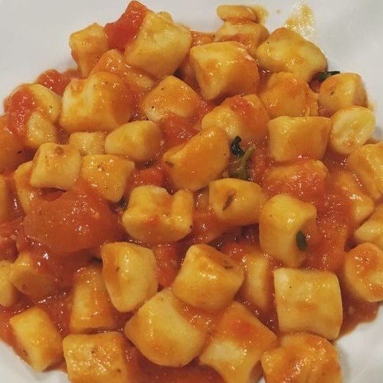 Marmita com nhoque caseiro de batata inglesa ao molho vermelho, servido com camarões suculentos e temperados.