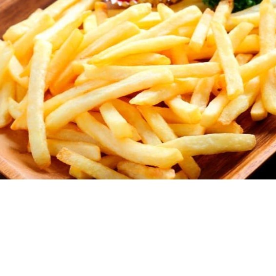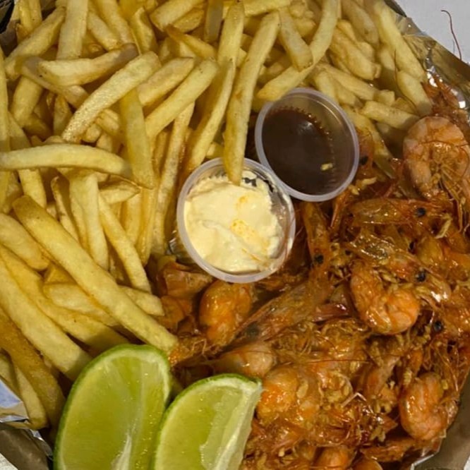 Porção média de batata frita crocante, acompanhada de camarões suculentos e temperados.