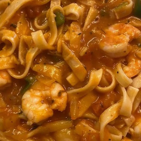 Marmita com fettuccine ao molho vermelho, servido com camarões suculentos e temperados.