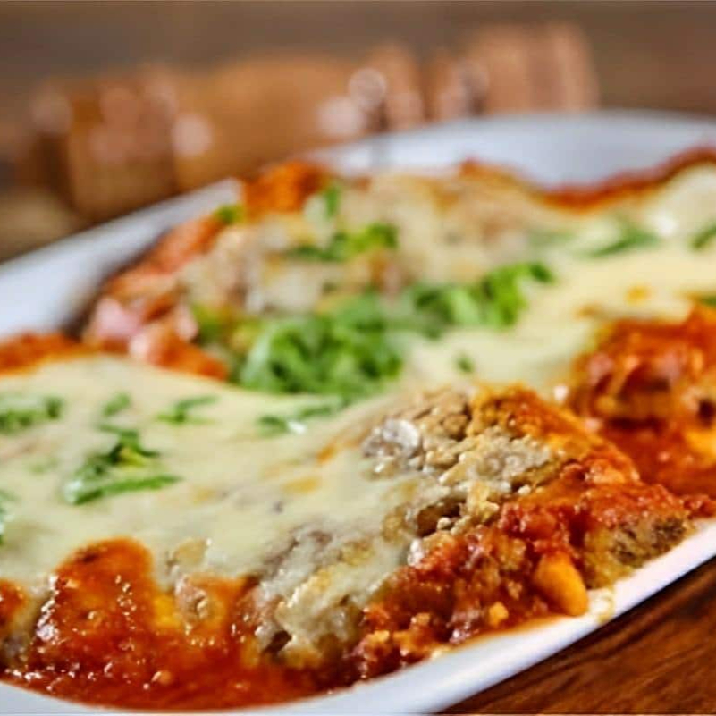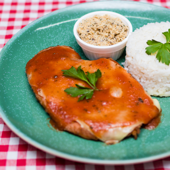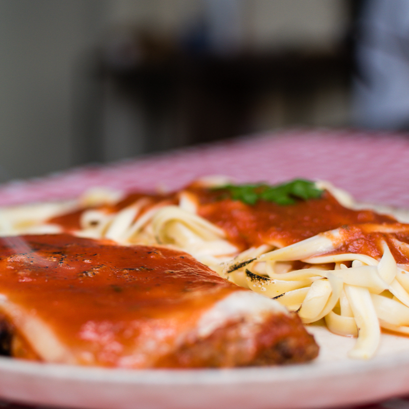 Bife empanado e gratinado com queijo mussarela, com delicioso molho da casa. Acompanhado da massa barilla fettuccine. Finalizado com queijo parmesão.