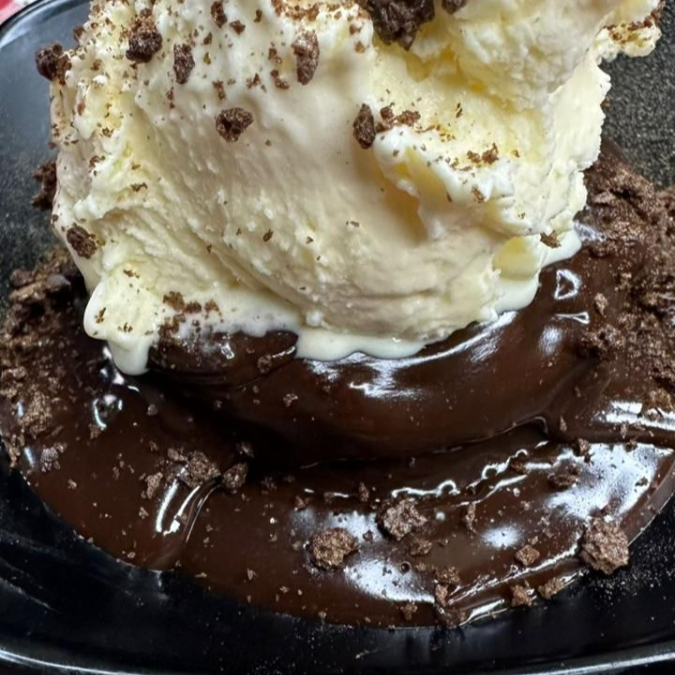 Duo de brownie com cookie. Finalizado com sorvete e calda de chocolate.