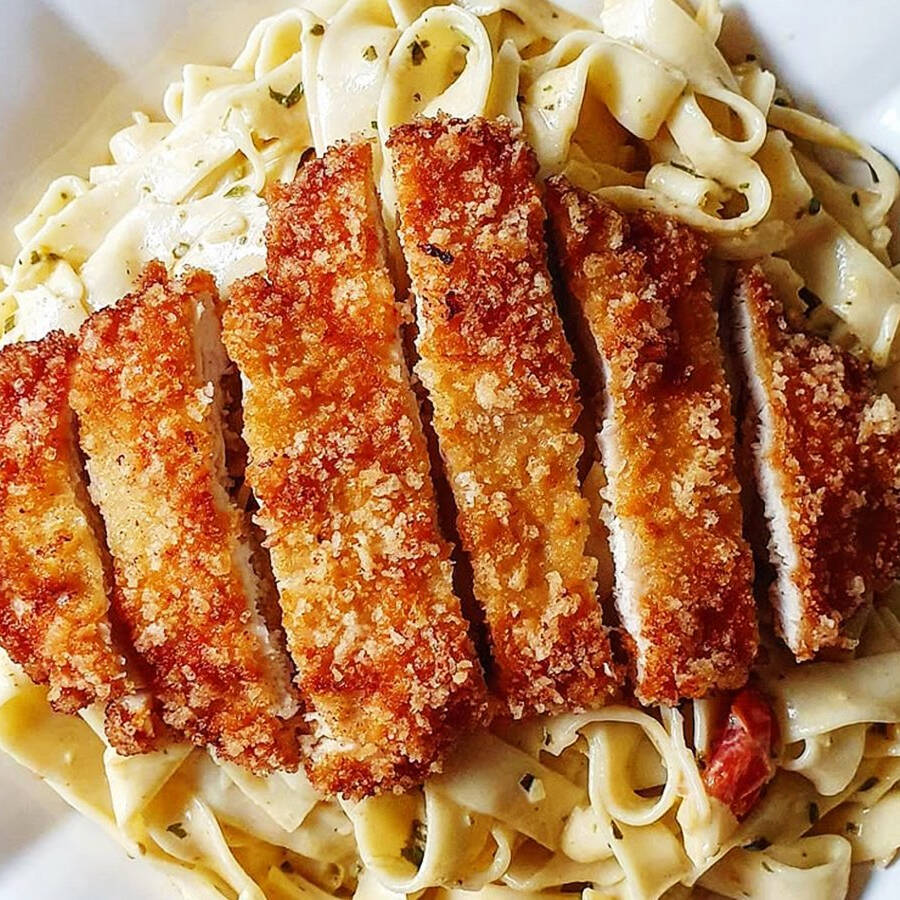 Fettuccine ao molho branco, acompanhado de tiras de frango empanado. Finalizado com queijo parmesão.