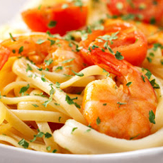 Massa barilla linguine, preparada no alho e óleo. Servida com camarão selado no azeite e finalizado com tomate cereja e queijo parmesão.
