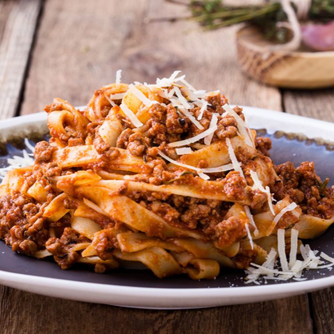 Espaguete à bolonhesa com tradicional molho pomodoro e carne moída.