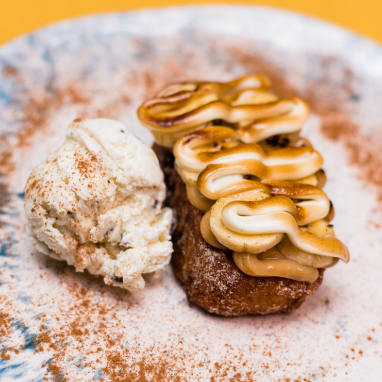 Nossa rabanada feita com pão artesanal produzida por nossa chef. Acompanhado uma camada de doce de leite, rodelas de banana e chocolate branco. Finalizada no maçarico e servida com uma bola de sorvete.