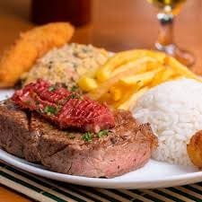 Contra-filé com arroz, batata frita, farofa e linguiça