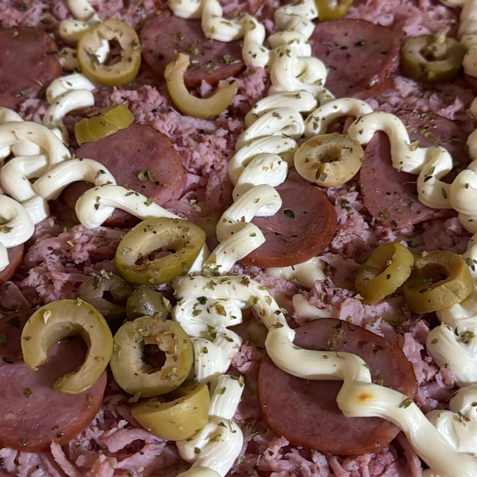 MOLHO DE TOMATE, MUSSARELA, PRESUNTO, CALABRESA, CREAM CHEESE, AZEITONAS E ORÉGANO