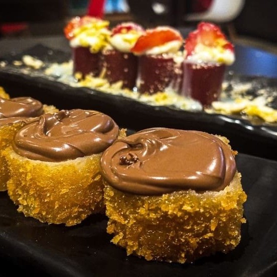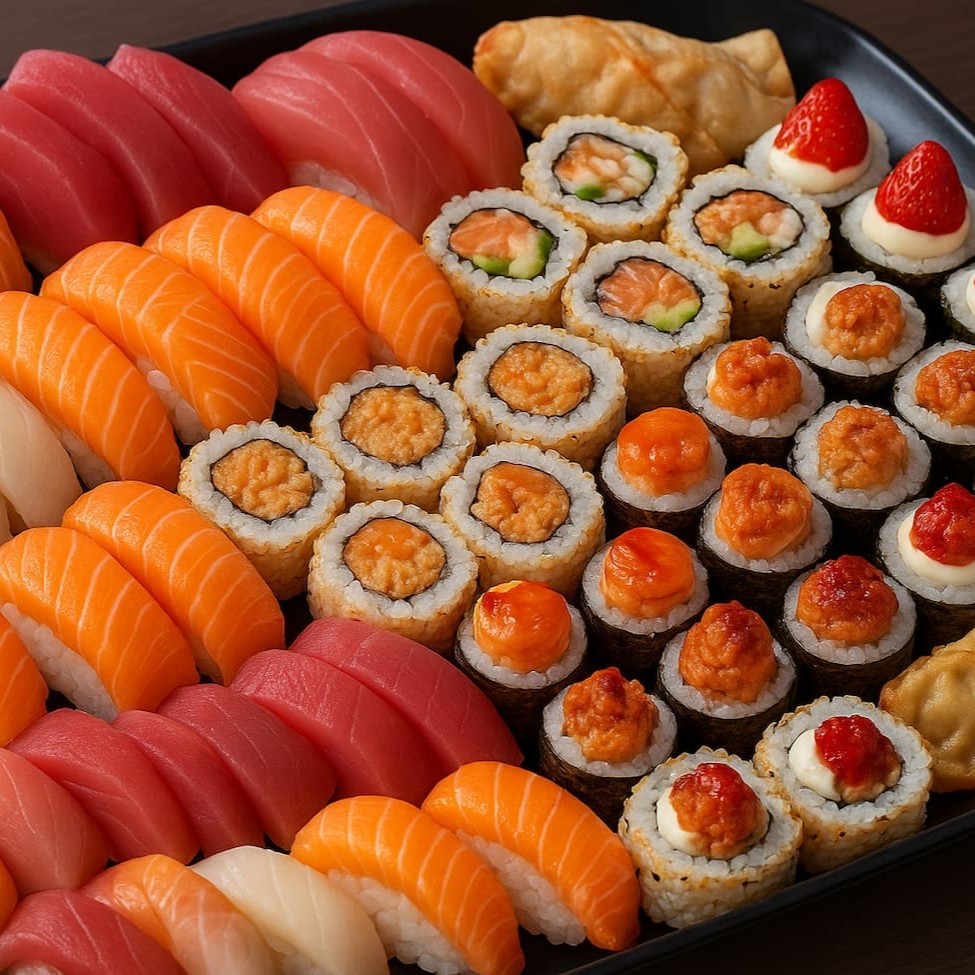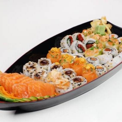 20 rolls a sua escolha + 4 sushi salmão 4 sashimi 4 joe tradicional 4 joe goiabada com morango