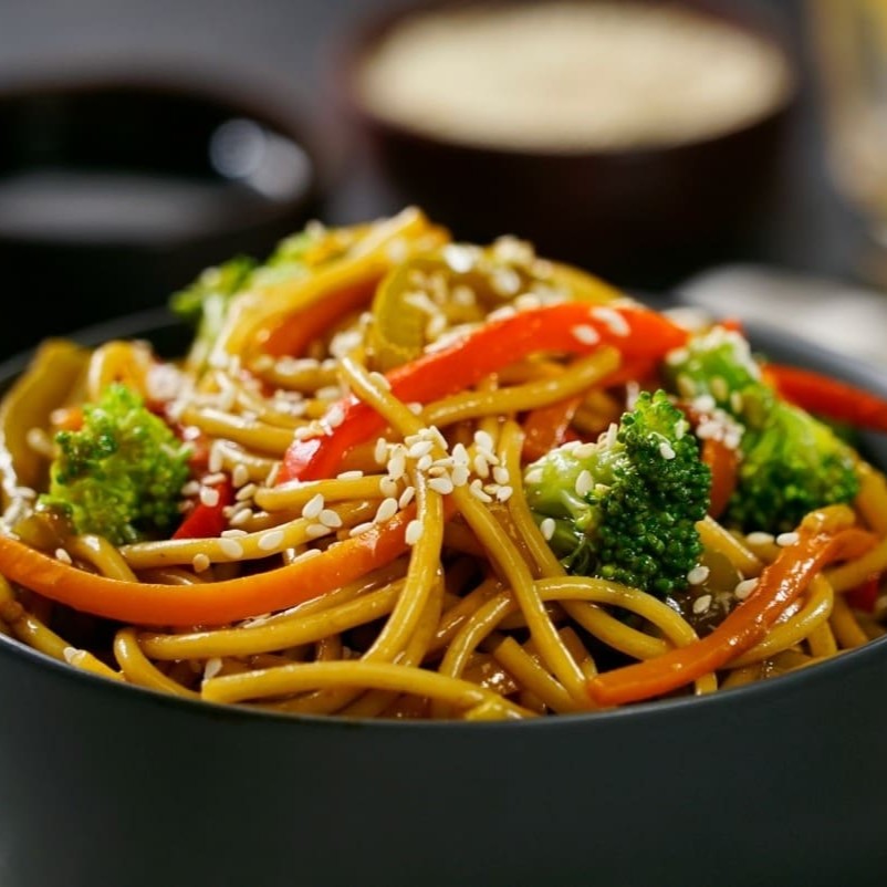 Massa oriental, legumes ( cenoura, repolho roxo, repolho verde e brócolis americano ) levemente refogados com um toque especial do molho da casa.