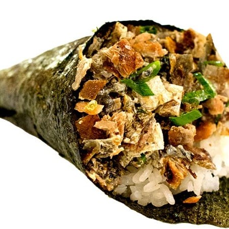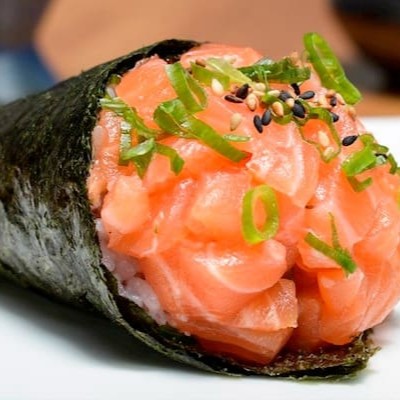 É feito com arroz, salmão em cubos e cebolinha, enrolados em alga nori e cortado em cone.