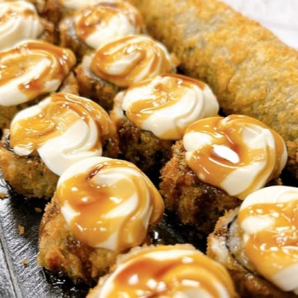 É feito com arroz, camarão salteado, cream cheese e cebolinha, enrolados em alga nori, cortado em cone e empanado na farinha panko.