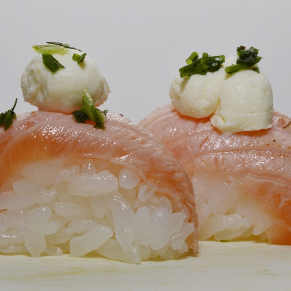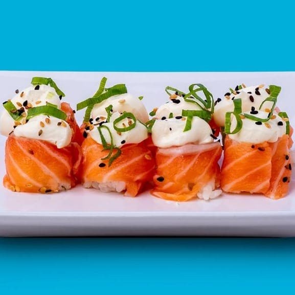 É uma bolinha de arroz temperado com molho shari combinado com salmão, cream cheese e cebolinha